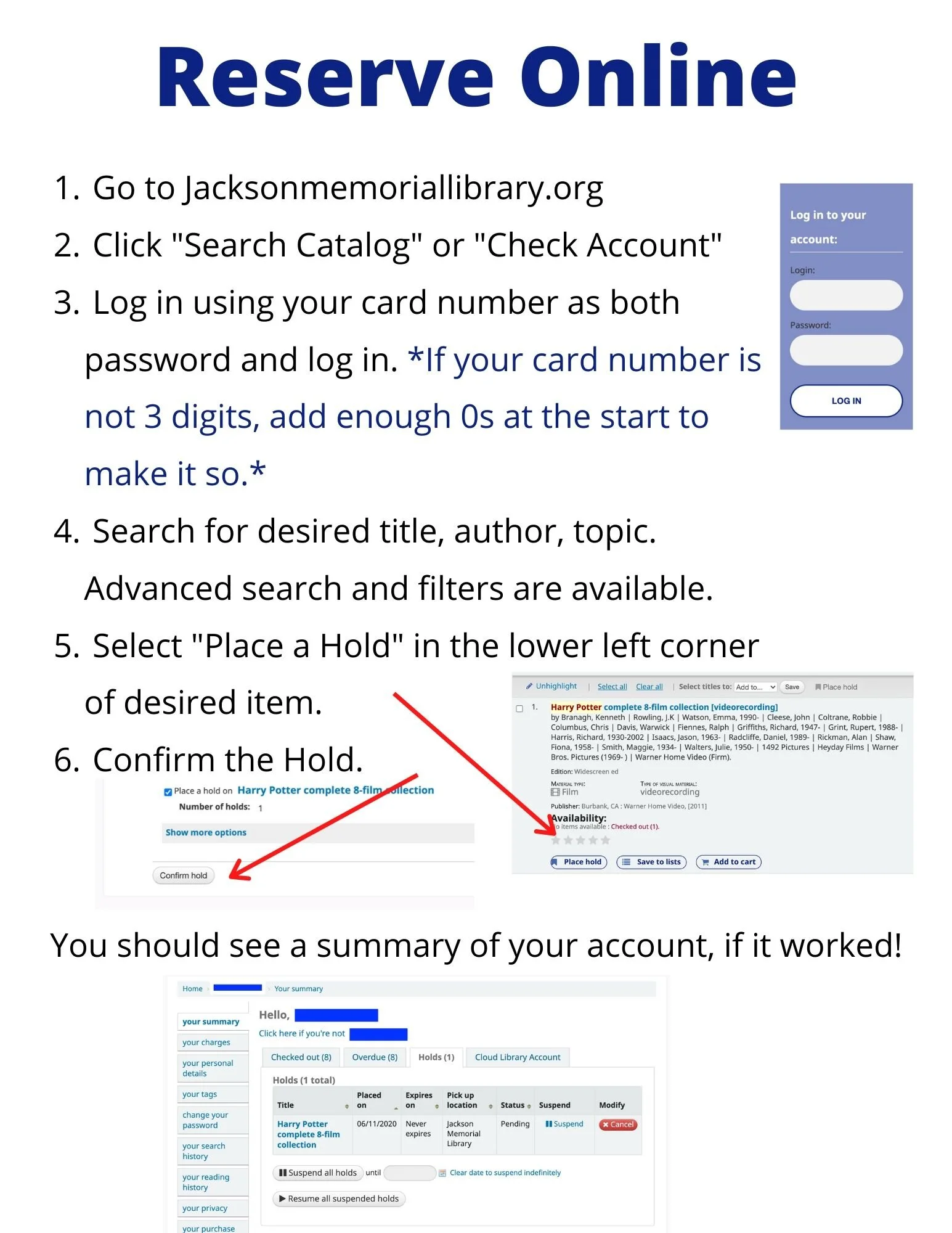 Holds may be placed online or by phone by leaving a message at 372-8961 with your Name, Phone Number, and the Desired Materials or filling out the form at the bottom of the page. Curbside pick-up is available during all regular library hours. Times subject to change. Don’t know your card number? There’s a form for that, too, at the bottom of the page.