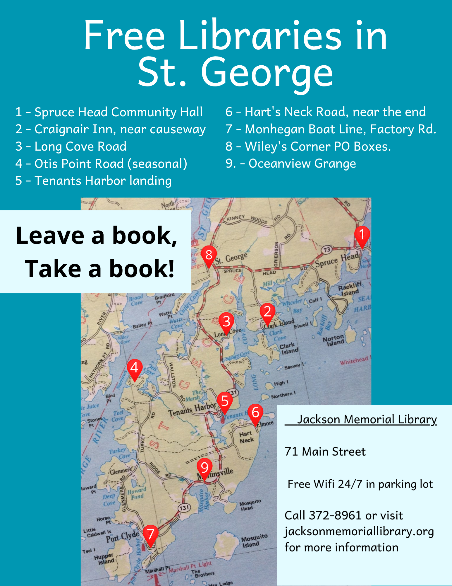 Jackson Memorial Library serves the St. George community in Mid Coast Maine by providing information, materials, services and programs to all ages for their education, enrichment and personal enjoyment. The Library provides a welcoming, comfortable public space for social interaction, civic engagement and quiet study.